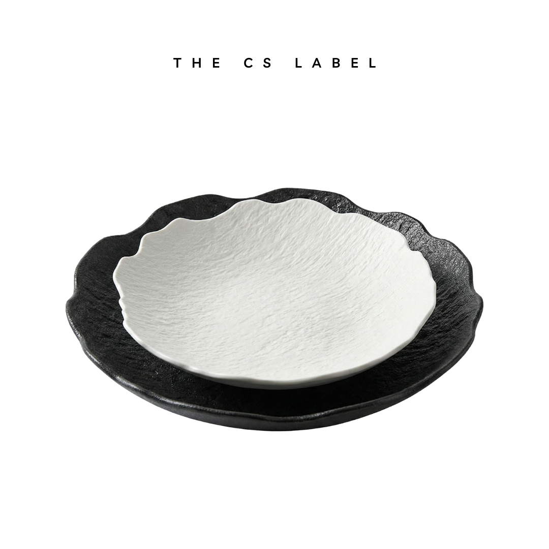 This Japanese-style stoneware plate features a distinctive rock-like texture and an irregular, wavy rim resembling a lotus leaf. Crafted from high-quality ceramic with an underglaze finish, it offers a rustic yet sophisticated aesthetic that fits perfectly into simple or wabi-sabi themed dining environments. Available in a frosted black or plain white finish, this deep soup plate is designed to elevate food presentation in hotels, restaurants, and home dining settings. Please note that while durable for general use, this specific finish is not suitable for microwave ovens.