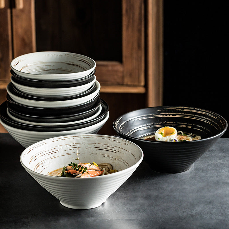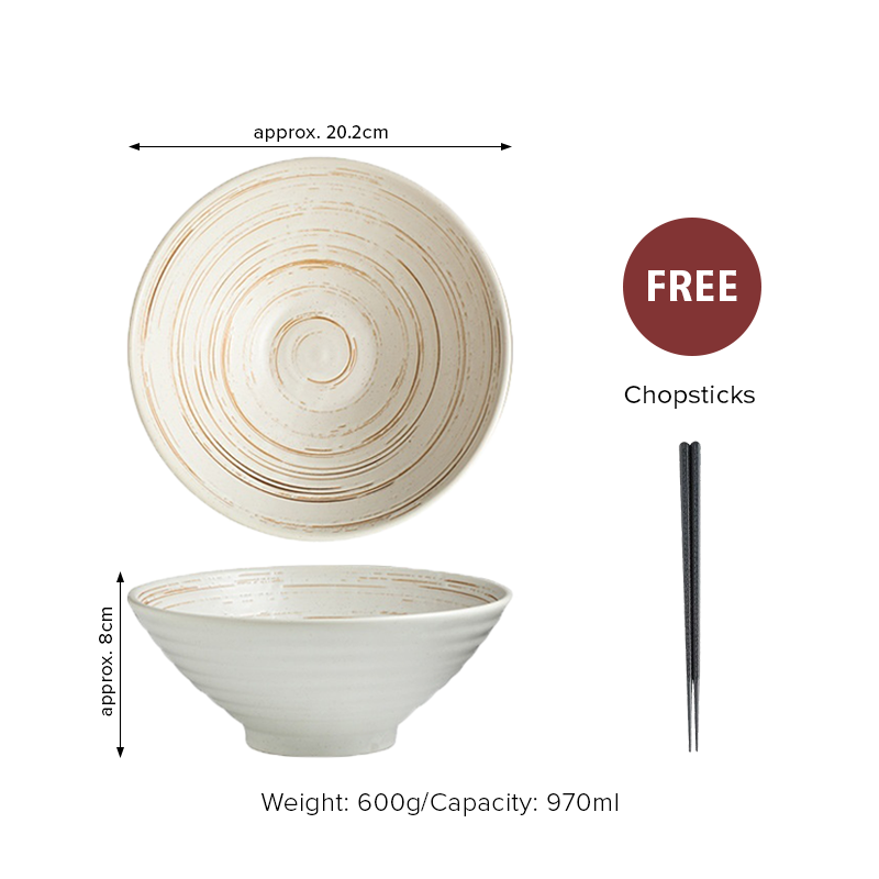Bring the authentic atmosphere of a Japanese noodle bar to your dining table with this elegant ceramic ramen bowl set. Crafted with a distinct brushed spiral texture, these bowls offer a simple yet sophisticated aesthetic that complements any modern kitchen. The deep, conical shape is perfectly designed for generous servings of ramen, udon, pho, or poke bowls, ensuring your toppings stay neatly arranged. Available in classic brushed white or black, each bowl is made from high-quality ceramic that feels substantial and durable. Depending on your selection, each set comes complete with matching chopsticks and an optional wooden spoon, providing everything you need for a complete dining experience.