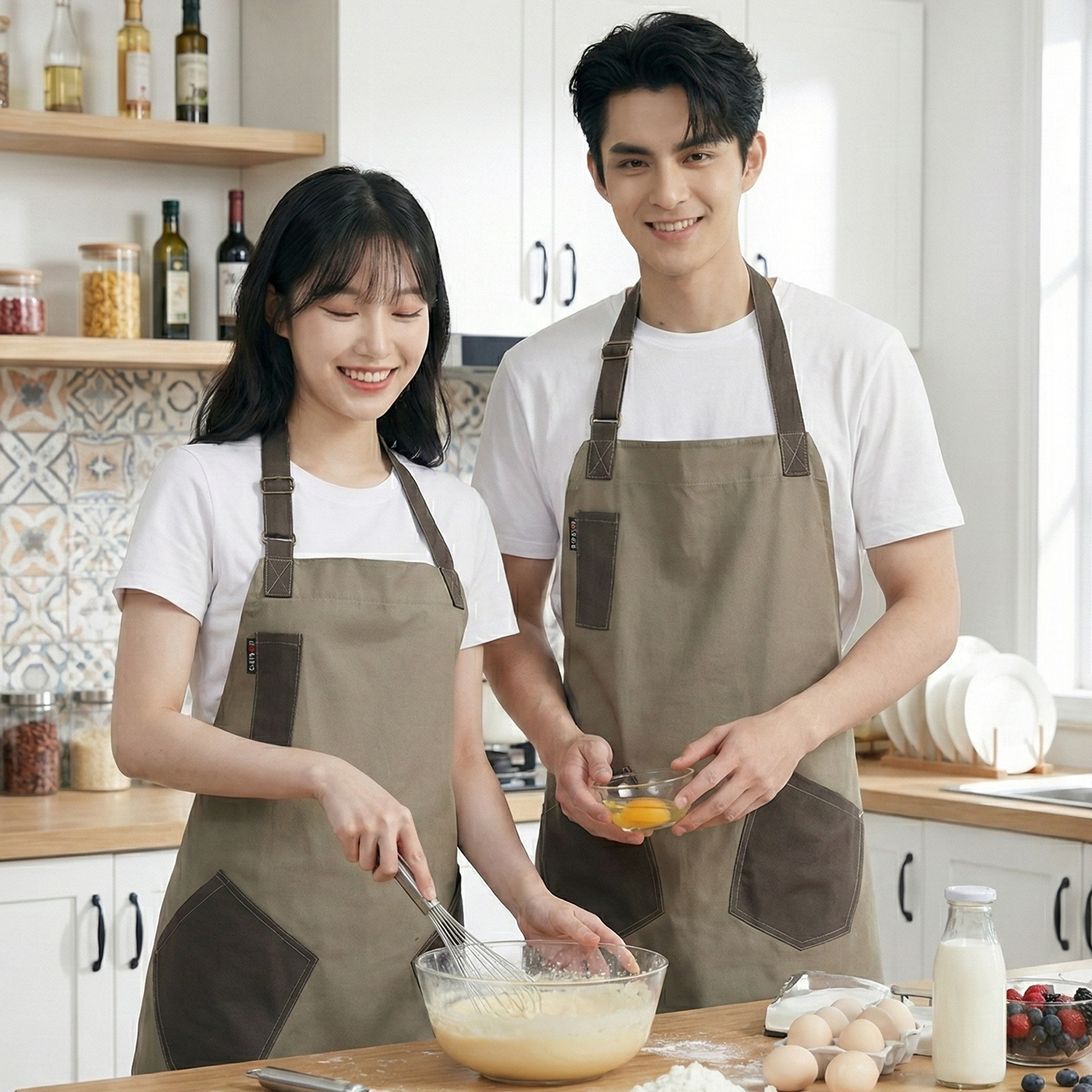 Practical and stylish two-tone apron, designed to meet the needs of home cooks, baristas, and workshop enthusiasts. Crafted from high-quality polyester, this apron offers superior antifouling properties, ensuring your clothes remain protected from spills, splashes, and stains during busy shifts or meal preparation. The design features a modern colour-block aesthetic, combining a neutral khaki base with a contrasting deep brown pocket and straps for a professional look. It is equipped with a generously sized angled front pocket, providing convenient storage for essential tools, recipe cards, or your mobile phone. The durable waist ties allow for a fully adjustable fit, making this free-size garment comfortable for a wide range of body types.